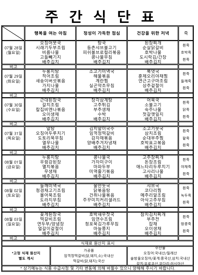 ★주간식단표(7.28~8.3)